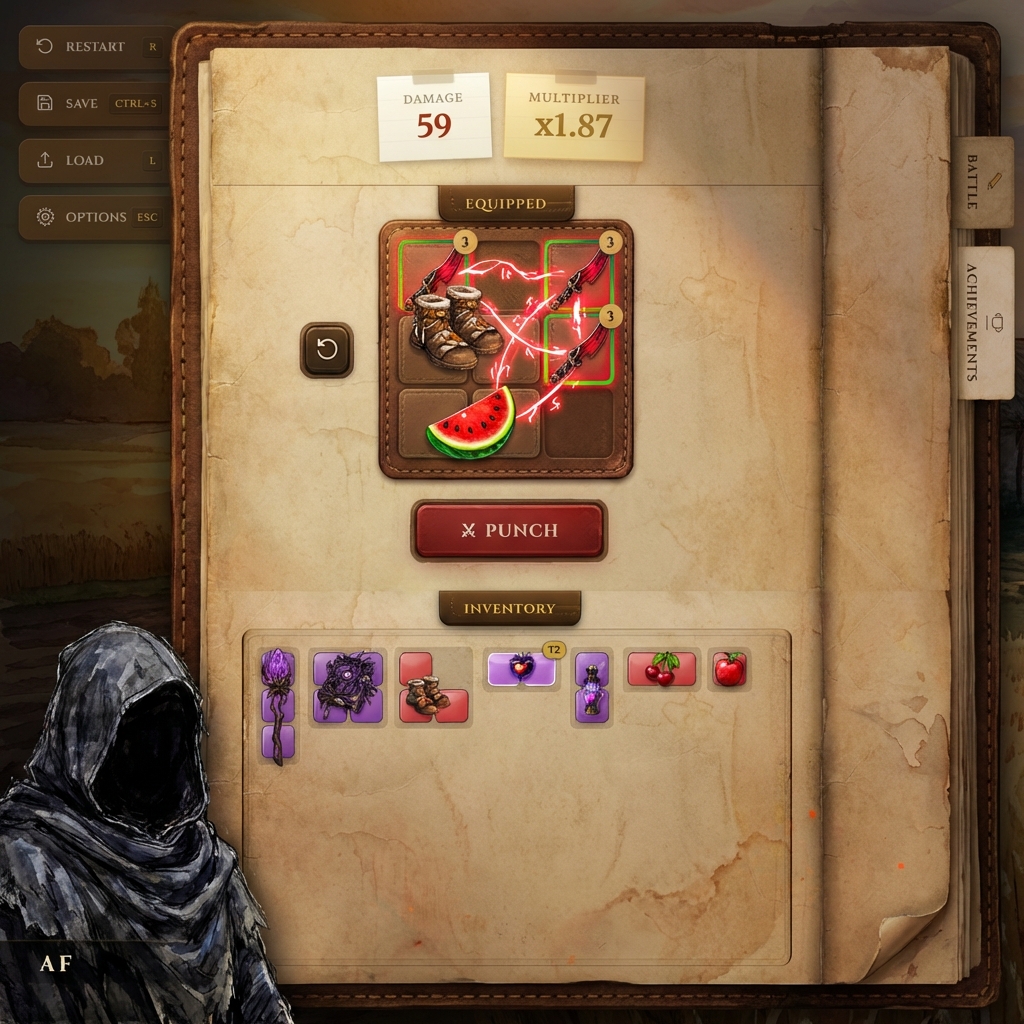 Draft items from a random pool, arrange them in your grid to trigger color synergies, and merge duplicates into legendary gear. Do you have the strategy to one-shot history's greatest legends?